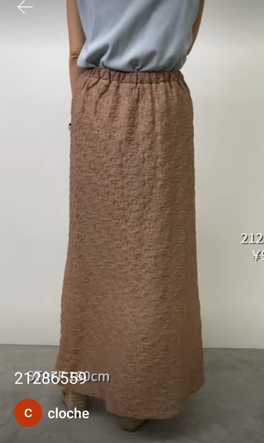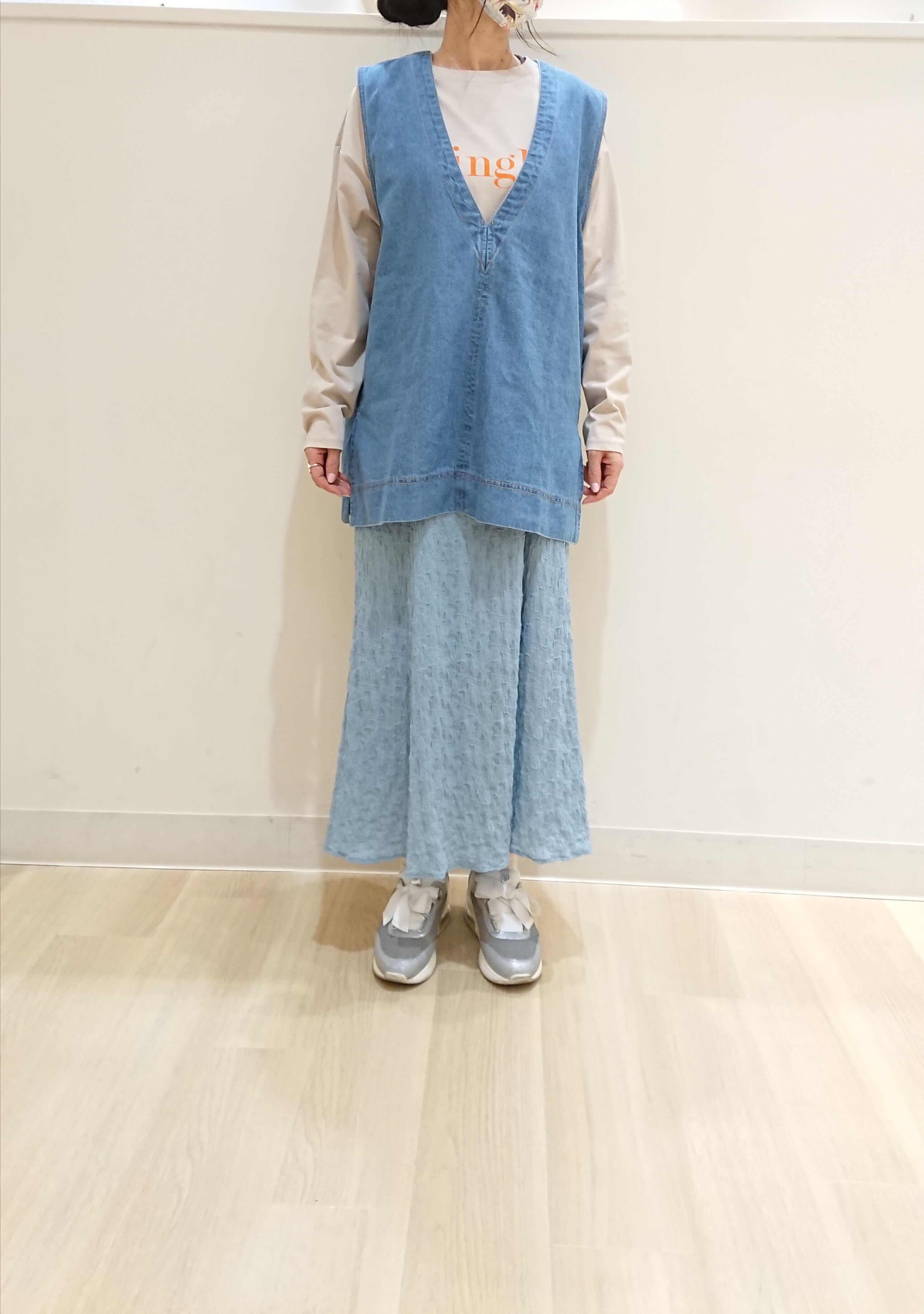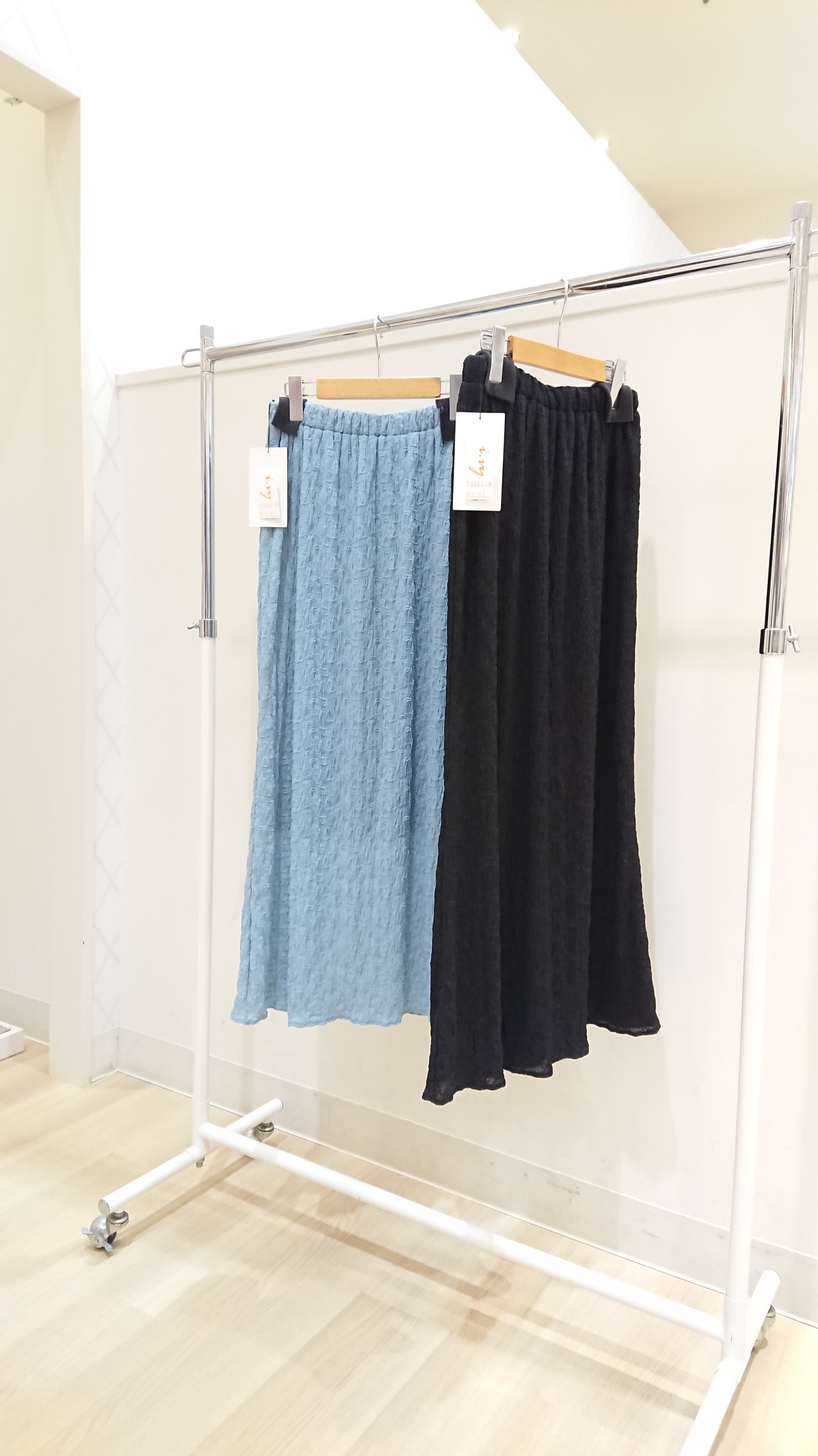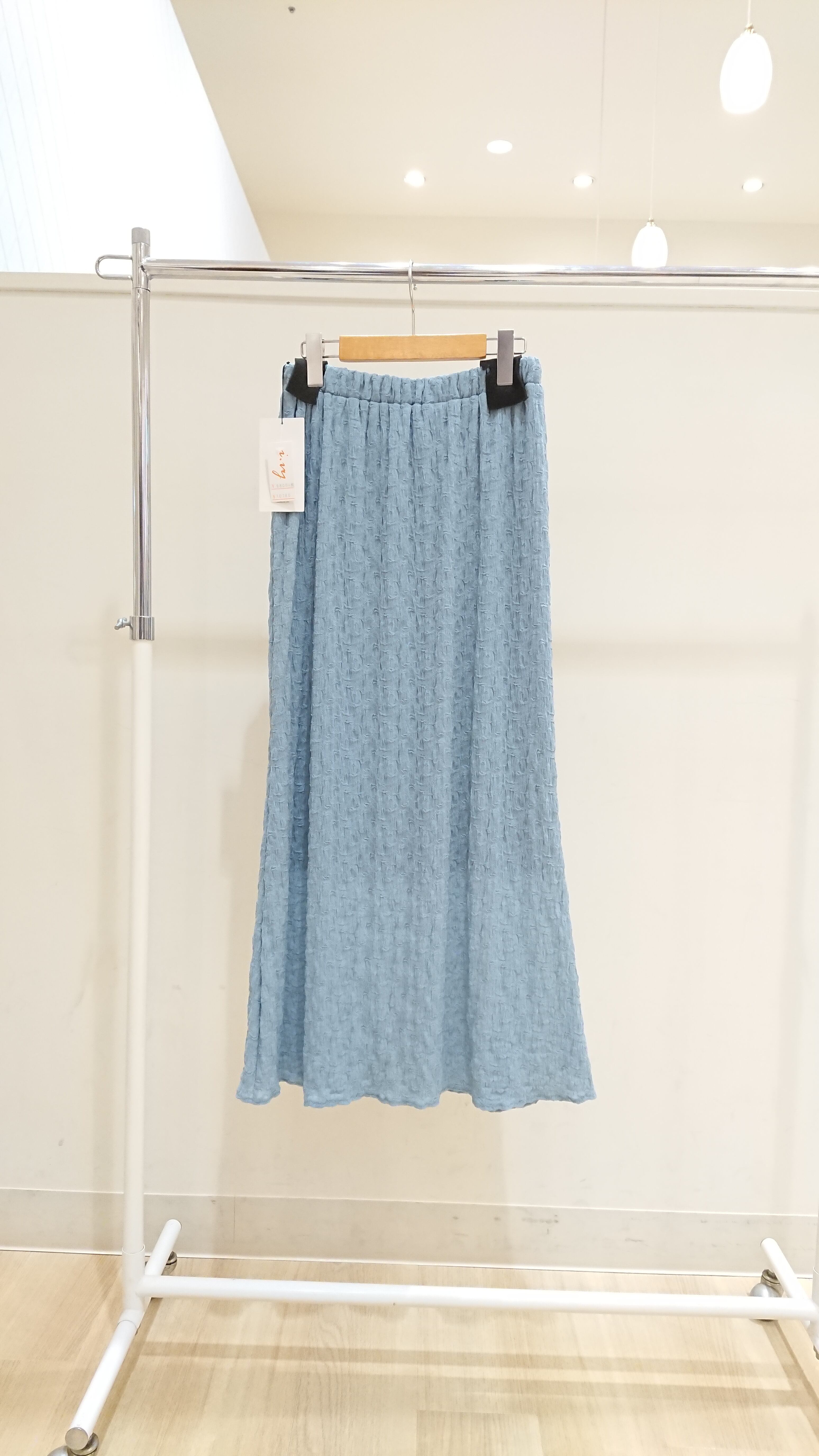 素材は軽く表面感のある生地を使用していて、表面のポコポコがボディラインを目立たなくしてくれます。今シーズン断然お薦めのスカートです!