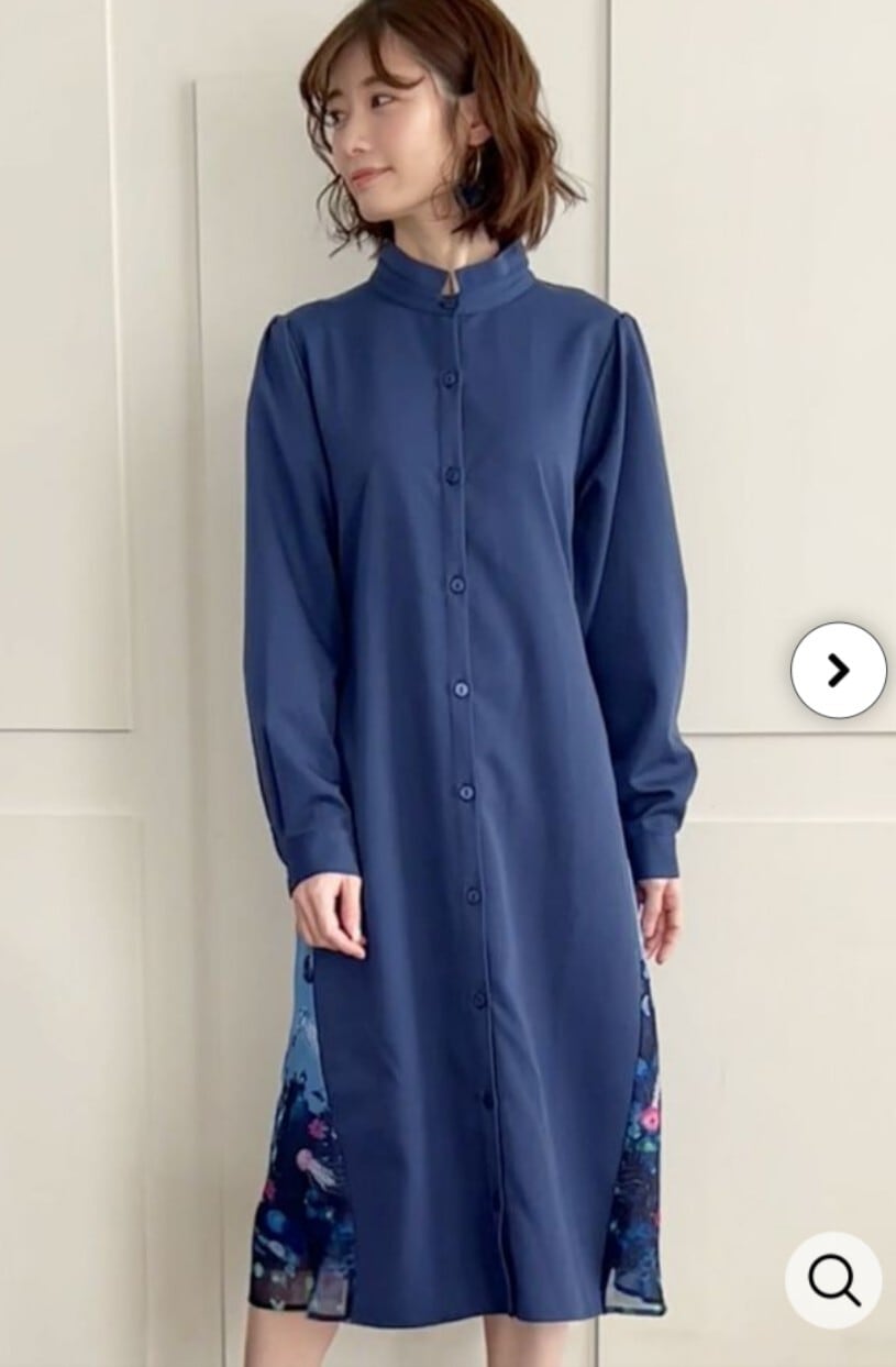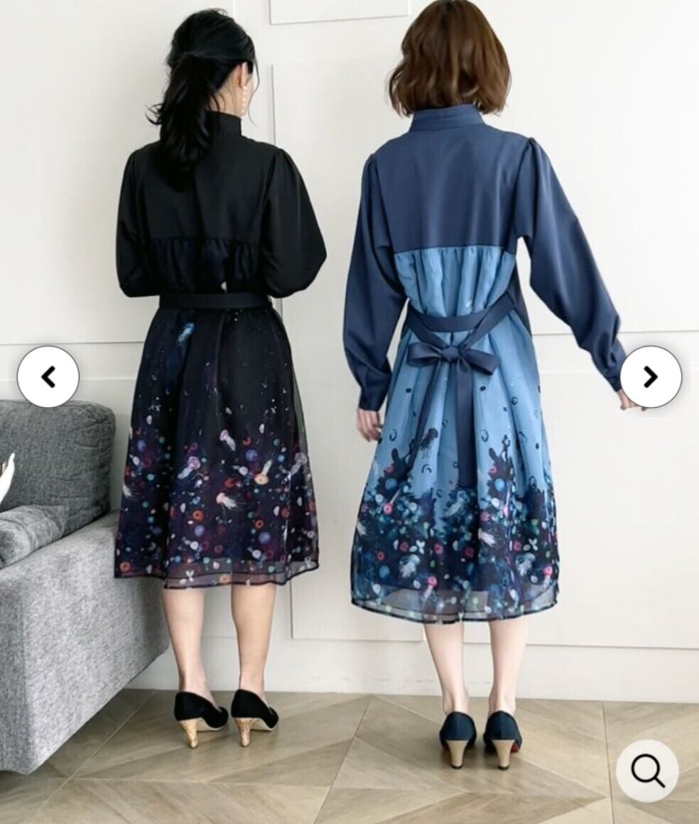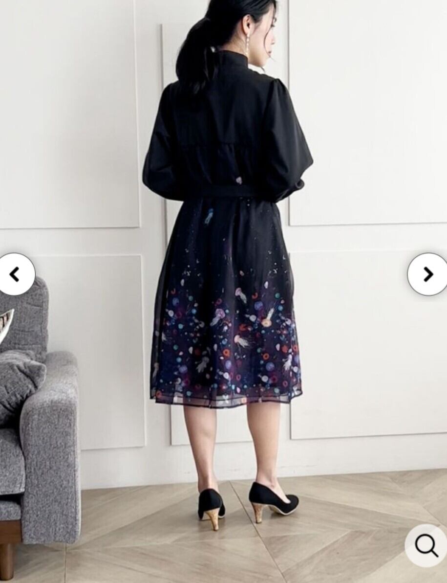フロントはキチンと感があって、バックスタイルは幻想的なクラゲ達が描かれた前開きワンピース。無地部分は光沢のある布帛生地を使用し、バックにはシフォンと変色チュールを重ね合わせた2枚仕立てになってます。ウェストにはとも布のベルトが付いているのでギュッと結んでシルエットに変化をもたせてもgood。