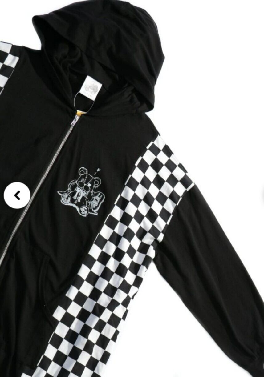 「うさぎの人形が大好きなくま」が変装している姿のプリントが可愛い個性派パーカーが入荷しました。ブロックチェックの切替がアクセントになったボーイッシュなアイテムです。